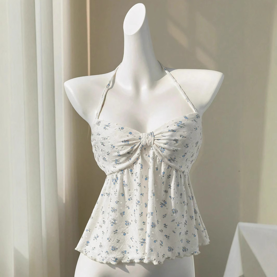 和風甘い小さな新鮮なレースアップ花柄キャミソールベビードールシャツ 2025 夏の新幅トップトレンディ