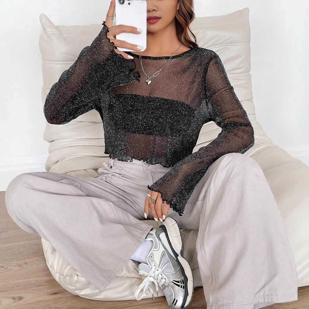 2025欧米の越境して新型の婦人服のメッシュの透明な高襟の長袖のレースの透視シャツの女性の上着