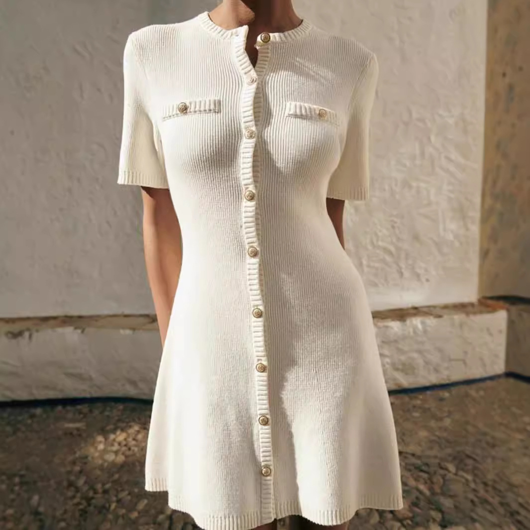 秋冬モデル速売通ファッション丸首修身痩せワンピースボタン純色偽ポケットA字ニットスカート