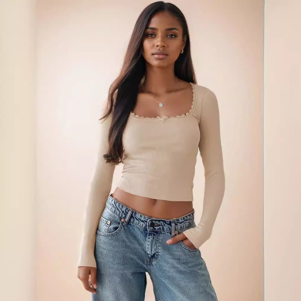2024長袖tシャツ女装wish国境を越えてやせているスリムレースは、腰のあるギャルの上着U襟のシャツをつなぎ合わせます