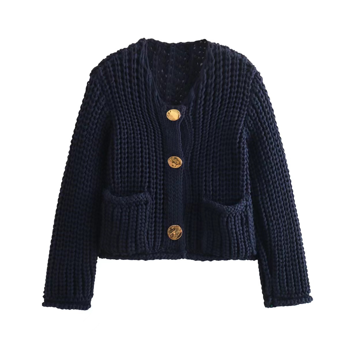 2024新型クロスボーダー女装欧米純色単列ラウンドボタンダブルポケットショート丈ニットコート女性