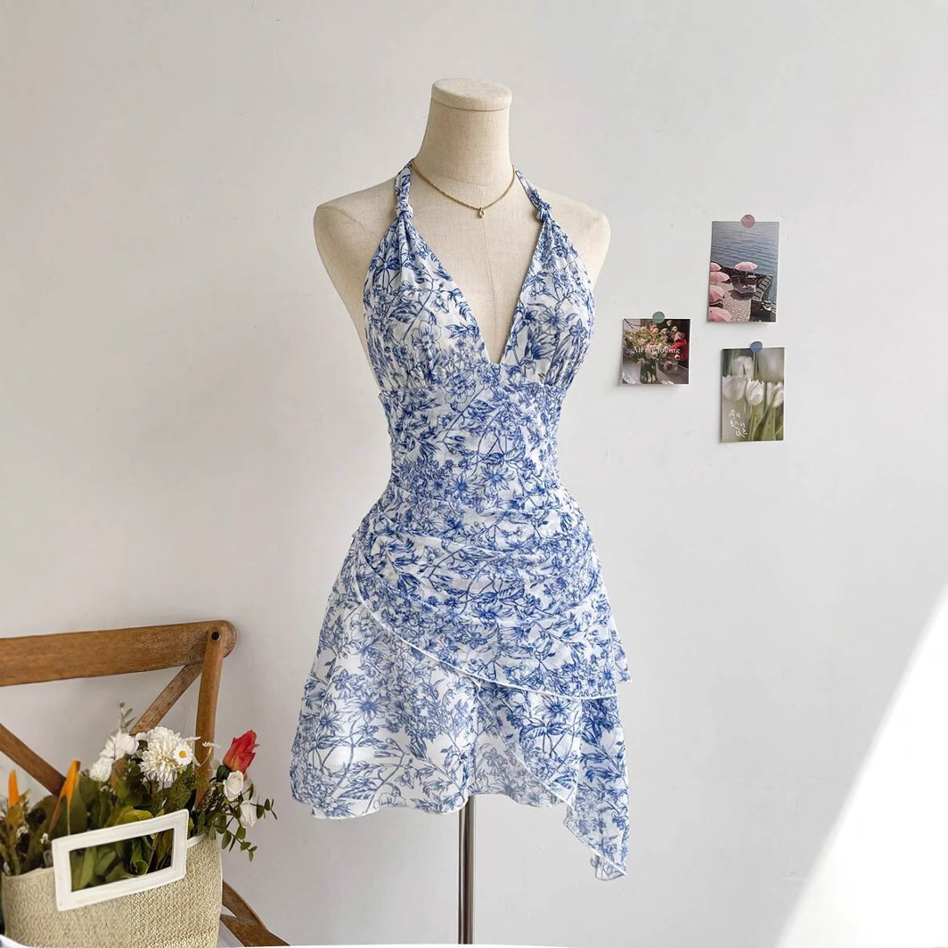 2025年ヨーロッパとアメリカの新しいブルーの花柄ドレス、ファッショナブルでカジュアルで甘いメッシュスリムスカート
