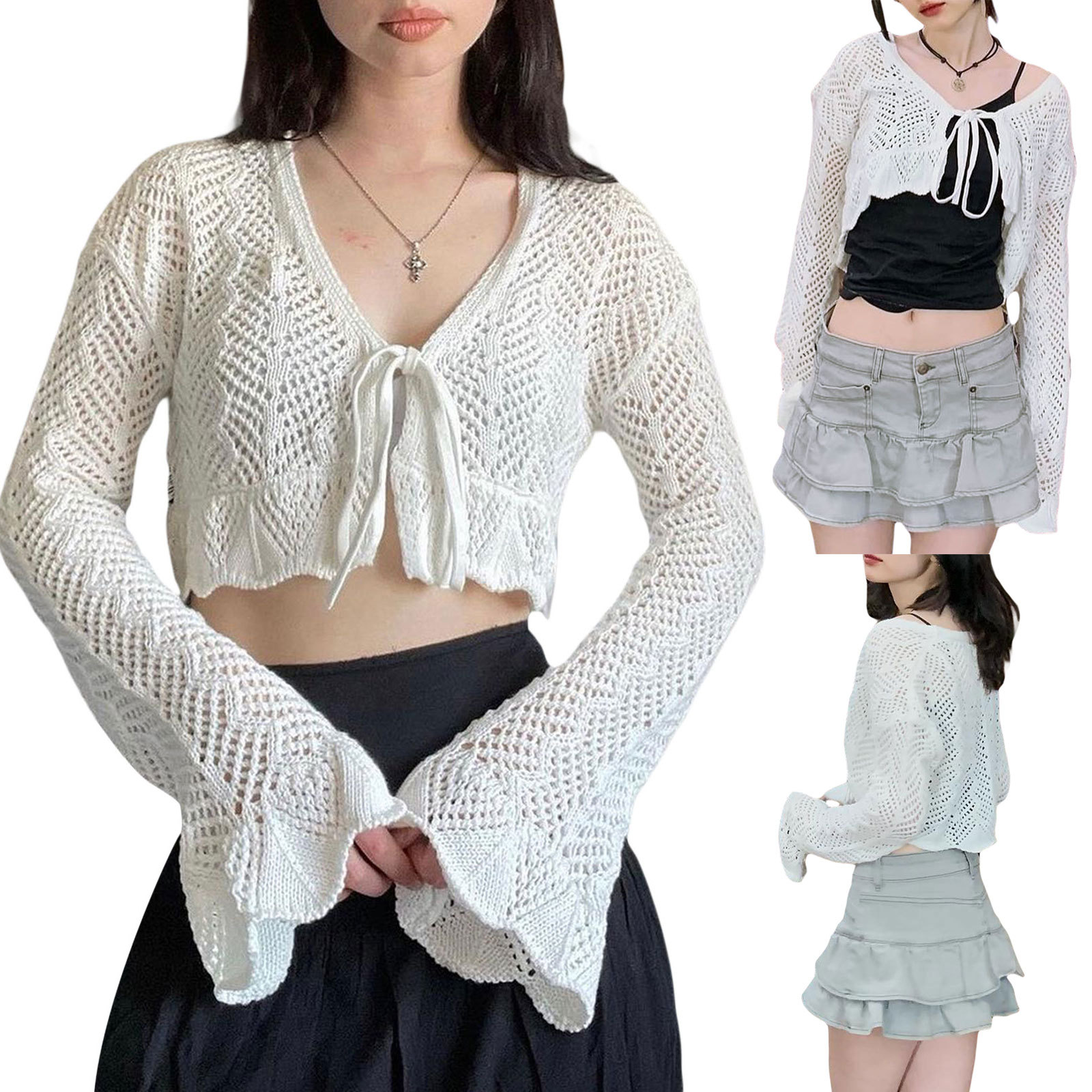 2022欧米の速売は透かし彫りのvネックのカジュアルな結びのラッパの長袖のカーディガンの女性を売ります。