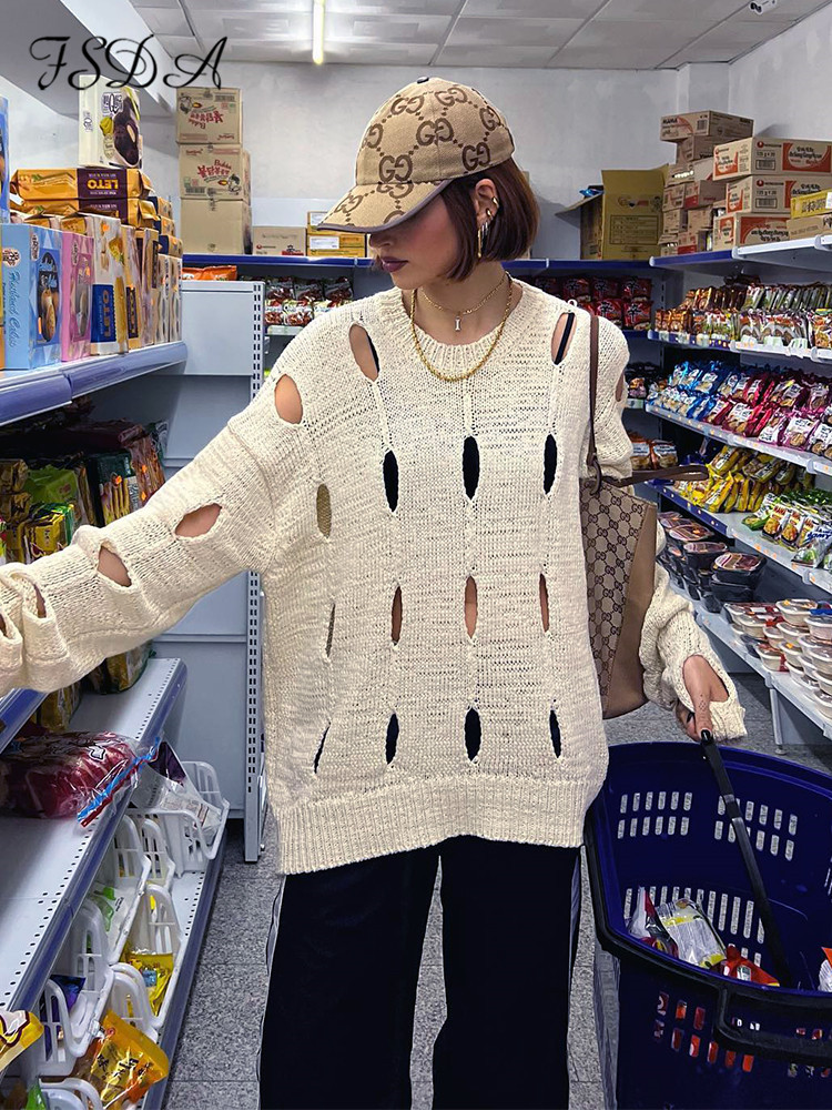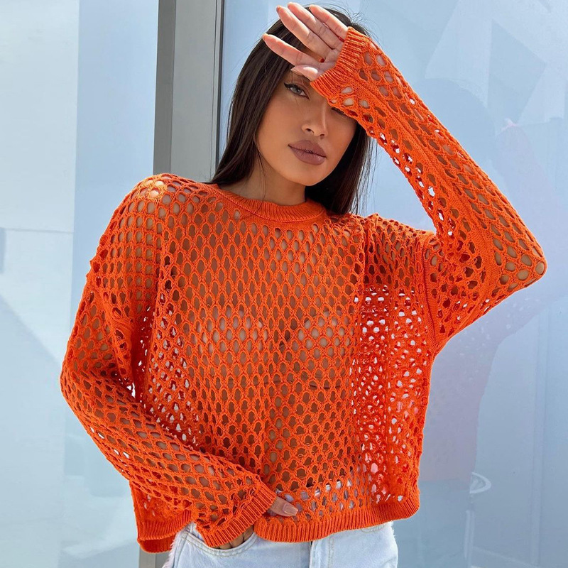 欧米の国境を越えた爆発物の透かし彫りセクシーな透視ニットtシャツの上着の女性2022ギャルの穴を割ったブラウスの外着
