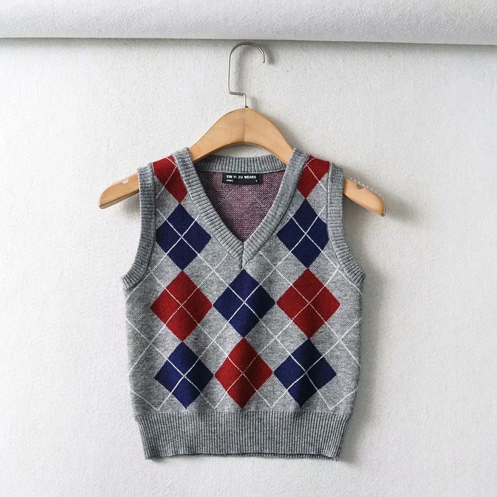 学院風のダイヤモンドの格子のニットのベスト2020秋の新型の欧米風のファッションのvネックの袖なしのベストの上着