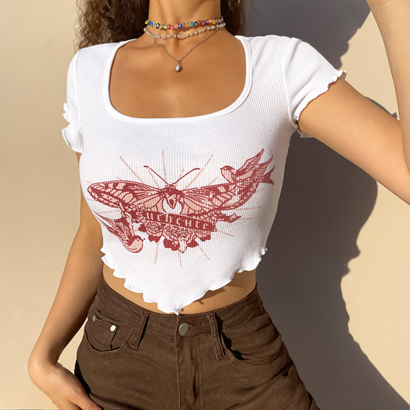 外国貿易アマゾン2021新型ファッション蝶プリントtシャツセクシーで不規則な短い臍丸襟上着