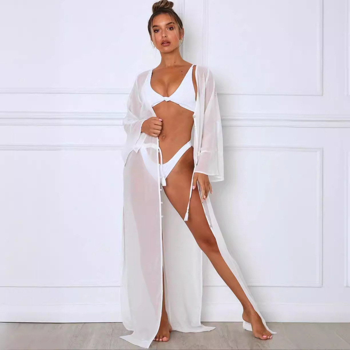 欧米のシフォンのシワのボタンの日焼け止めのカーディガンのビキニのブラウスの水着の外はビーチのコートの女性の休暇のスカートに乗ります。