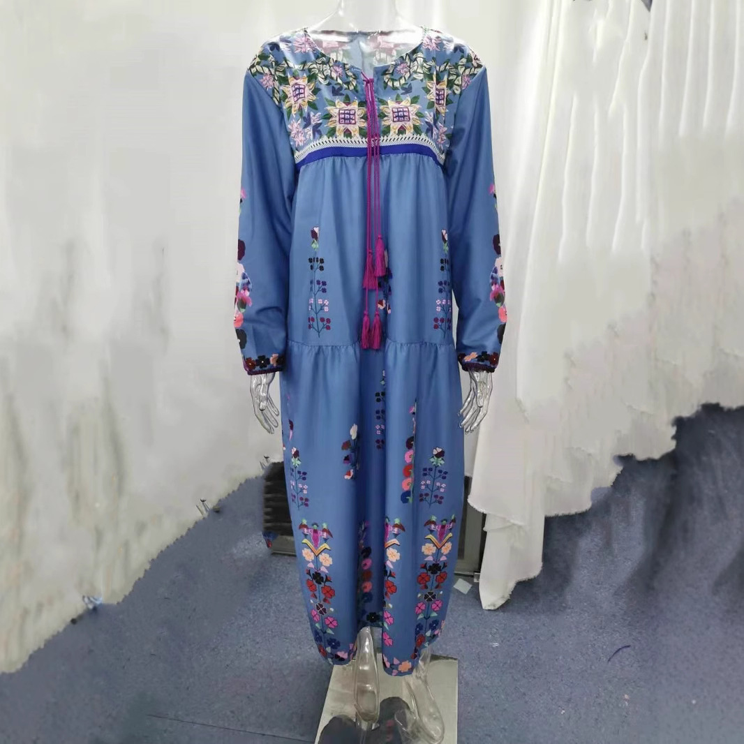 ボヘミアンヨーロッパとアメリカの貿易ポジショニングプリントフラワースプライシングロングスカートファッショナブルな巾着レースアップ長袖ドレス