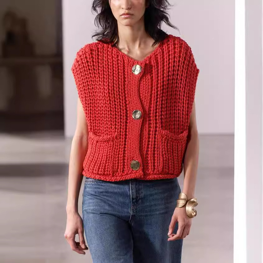 アマゾンの女性のニットの上着の欧米の太い針のvネックの袖なしのベストのファッションの気質の短いカジュアルなセーター