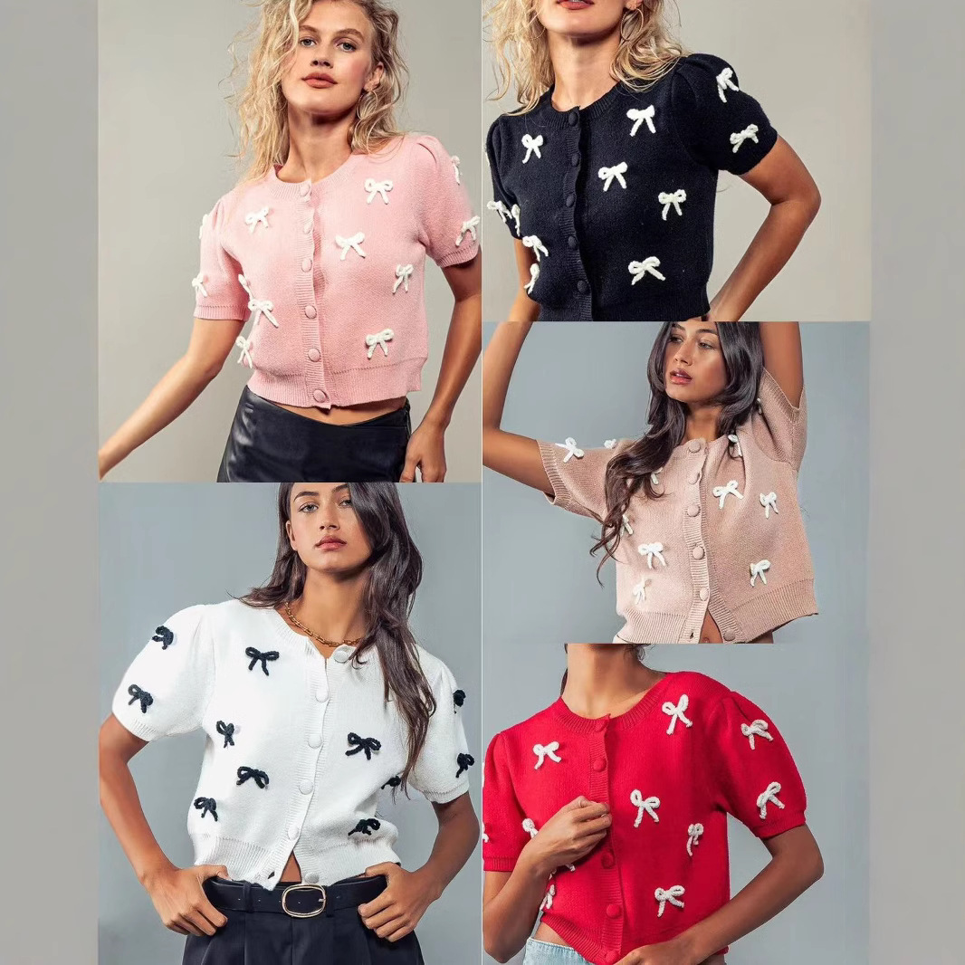 春と秋の越境の新型の蝶結びの甘いカーディガンの上着の丸首の半袖のボタンのカジュアルな百合のニットのコート