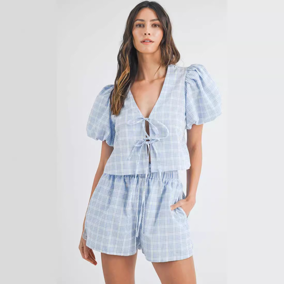 速売通女装欧米気質vネックリボンリボン泡袖上着カジュアルパンツ格子2点セット
