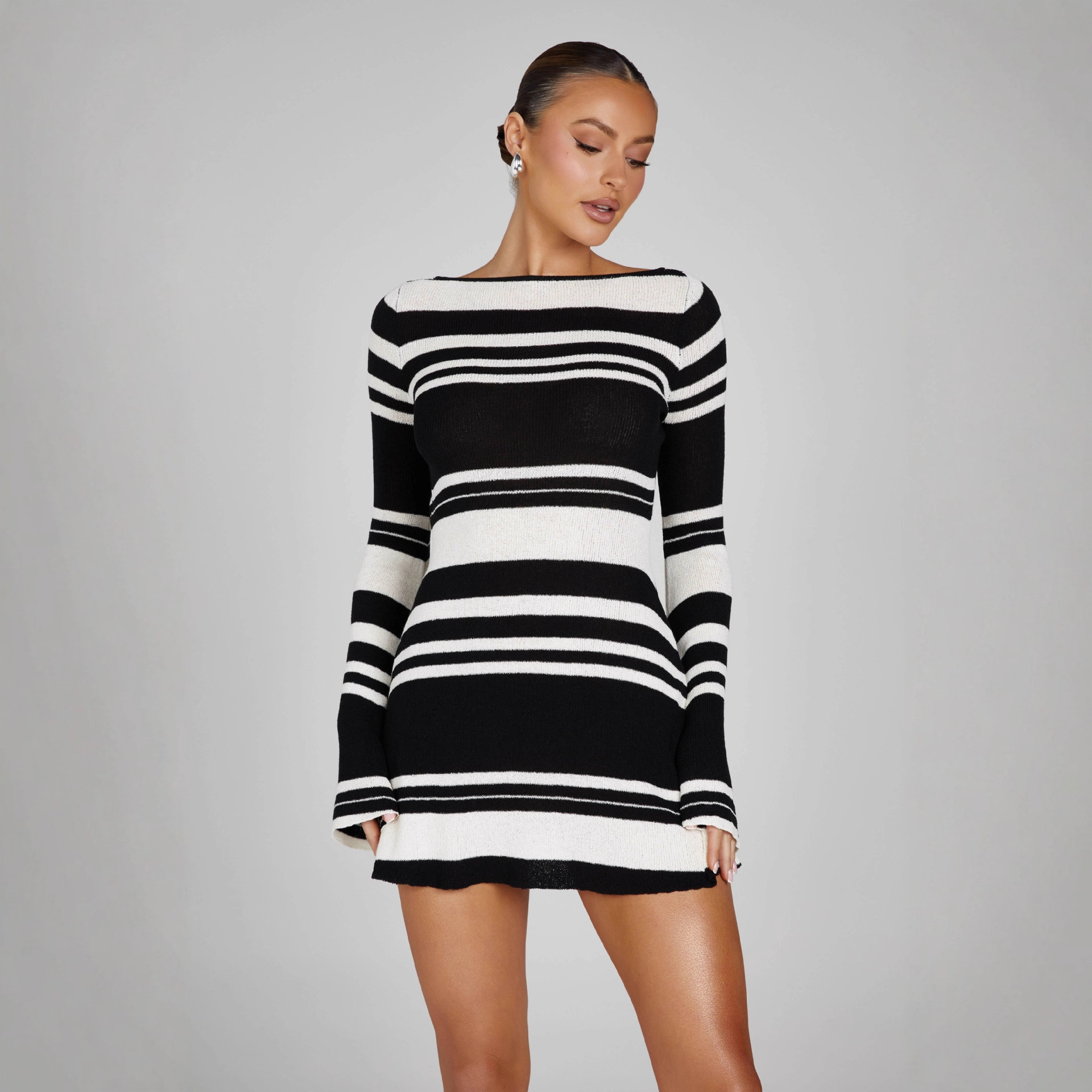 欧米の婦人服の秋の新型の気質のラッパの袖は背中を現して色のストライプのメリヤスの修身をつづり合わせます。