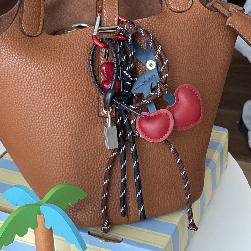 Iu風小衆復古皮質さくらんぼ包ストラップ韓系博主コーヒー色編みストラップ