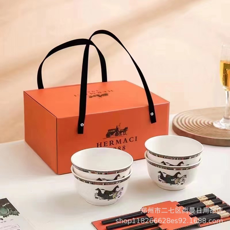 馬は成功した四碗の箸の碗の陶磁器の食器のセットのお土産に手を差し込みます。