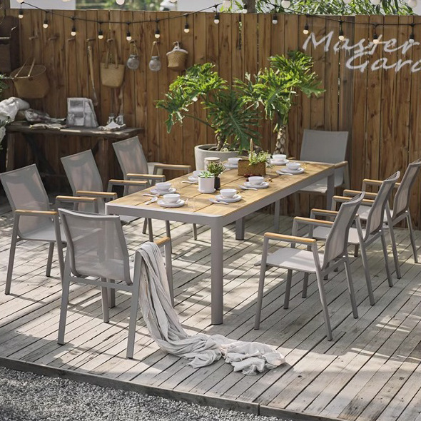 屋外プラスチック木製テーブルと椅子、中庭の組み合わせ、防食と日焼け止め、シンプルなレジャーテーブルと椅子、屋外テラスガーデンアルミアートテーブルと椅子