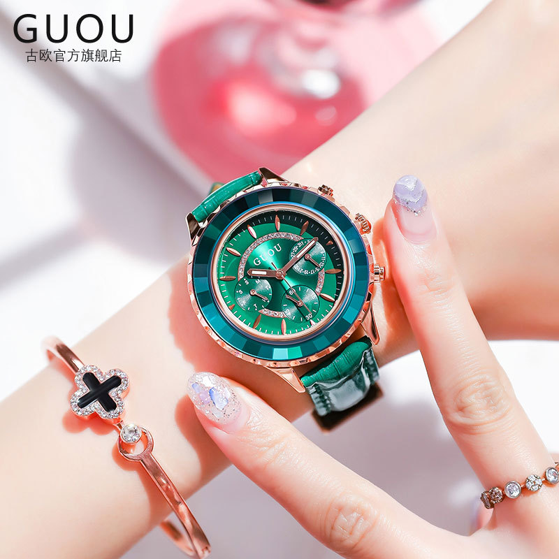 2023新品guou腕时计レディースins风シンプルカジュアル多机能大気ファッション防水気质レディース时计レザー