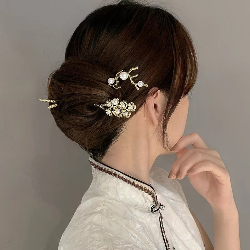 金属製の簪、古代風の真珠簪、髪飾り、旗袍簪、女性用漢服、レトロなスタイル