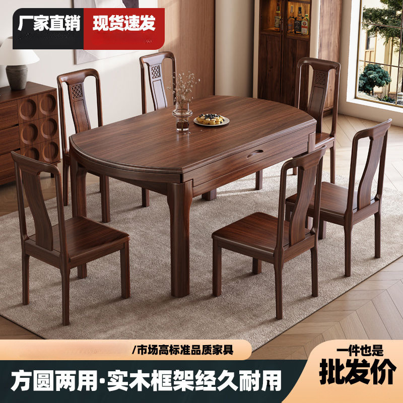 新しい中国風の黒檀無垢材のダイニングテーブルと椅子の組み合わせ、拡張可能な折りたたみ式の正方形と円形の両用ラウンドテーブル、ホームレストランのダイニングテーブル