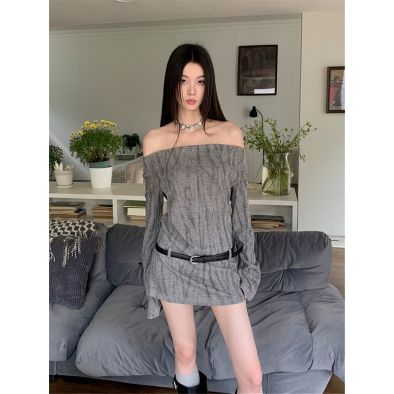 秋の新しい白いしわ低腰長袖ニットワンピース