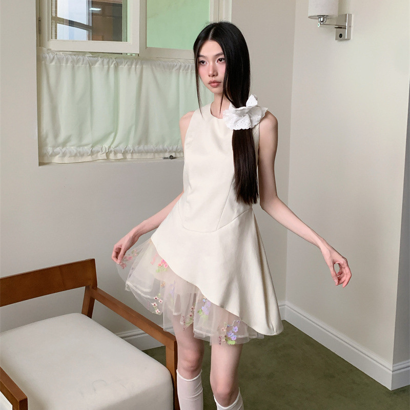 スポットホワイト気質バレエ風チュチュスカートスリムフィット不規則な裾ノースリーブベストドレス
