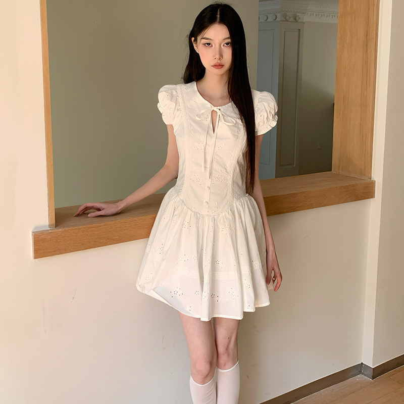 現物実写2024夏服新型フレンチ式ウエストワンピースデザイン感露背vネック泡袖ロングスカート