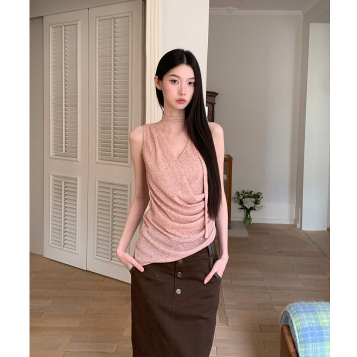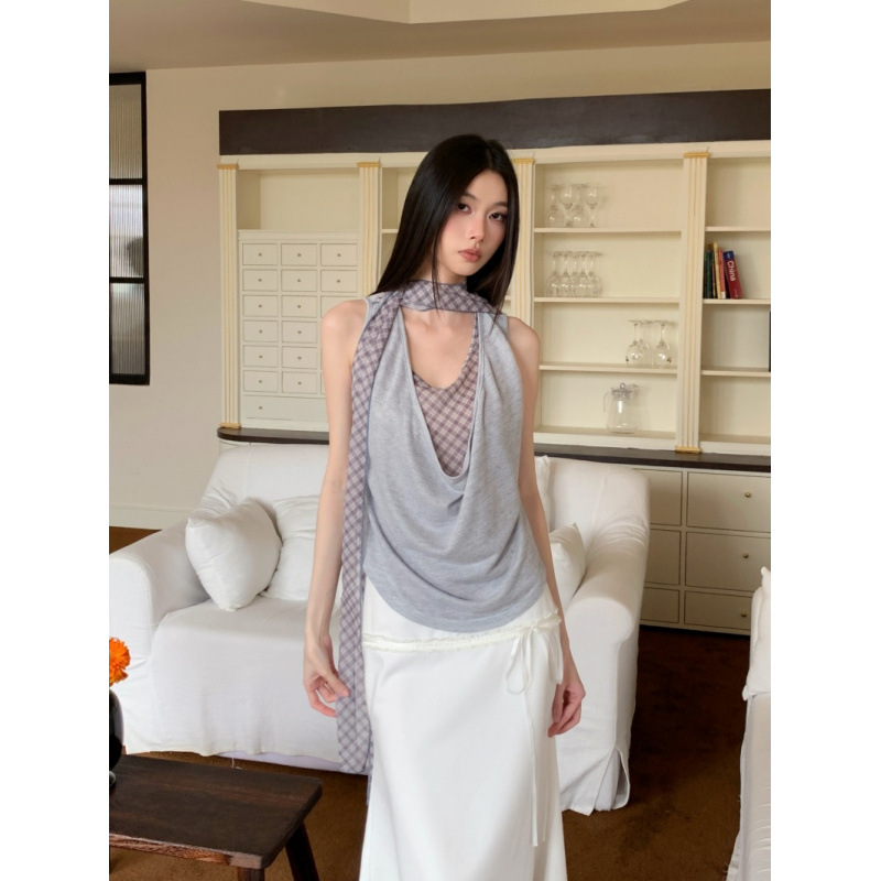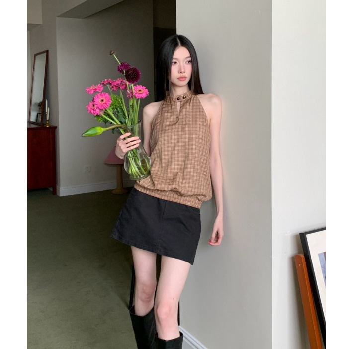 ダブルボタンノースリーブホルターネックキャミソールレトロブラウンチェック柄トップ女性用