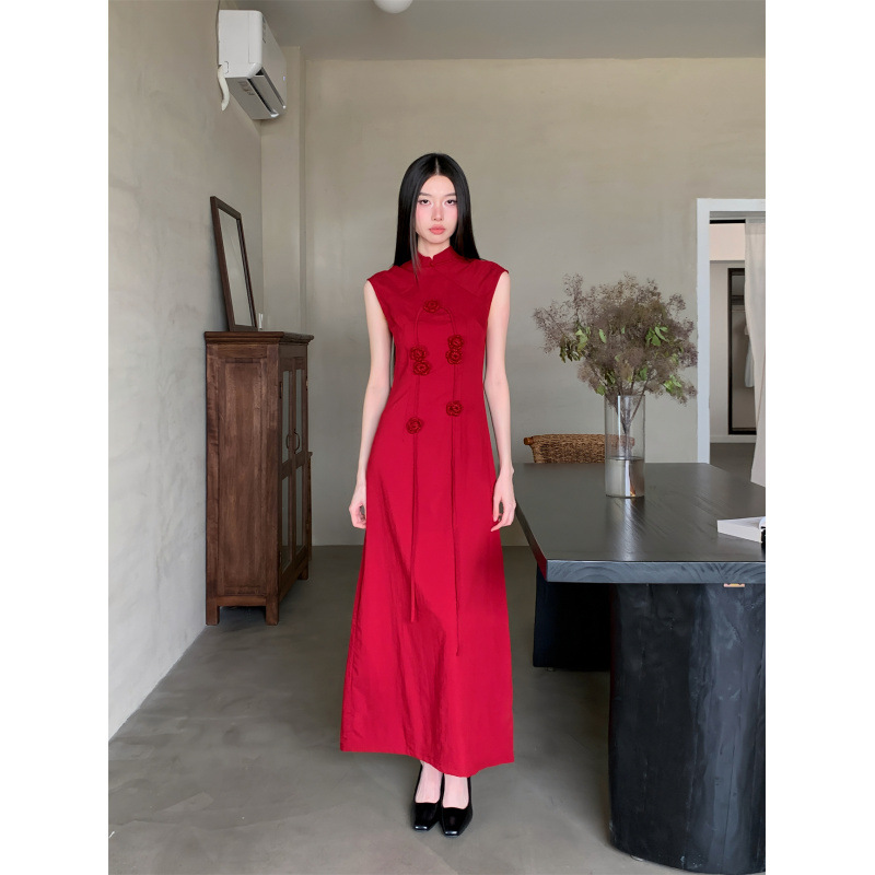 新しい中国風の赤い花のチャイナドレス新しい中国風のボタン乾杯ドレス女性用