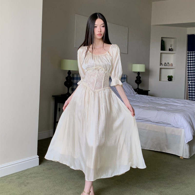 フレンチパレススタイルランタンスリーブレースステッチフィッシュボーンドレスミドル丈スカート