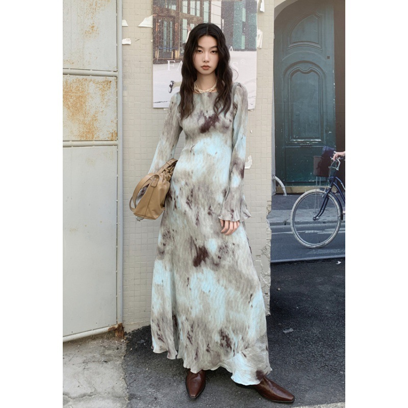 在庫あり リゾート風柄プリント バックレス スリム ロングドレス 3色