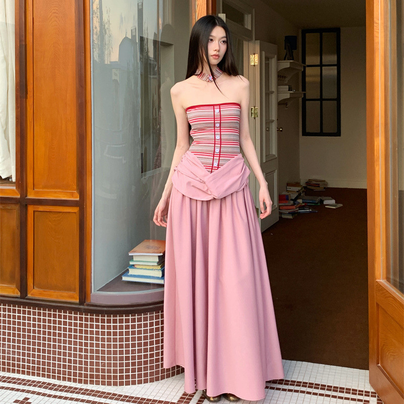 スポットグレーのホルターネックバックリボンドレス、バックレスプリーツイレギュラースカート