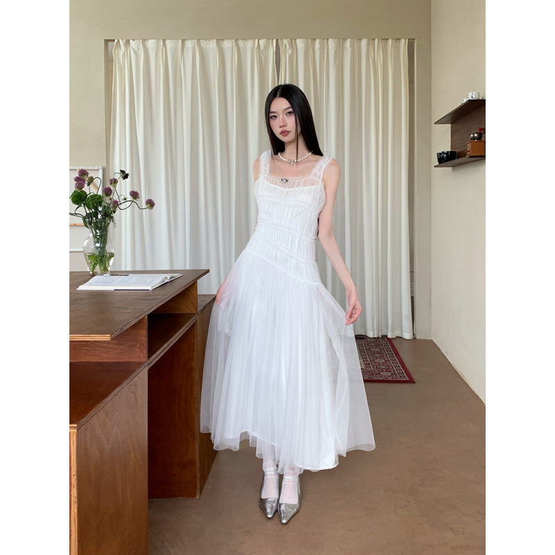 夏の軽くてふわふわのガーゼロングスカート無地メッシュサスペンダードレス