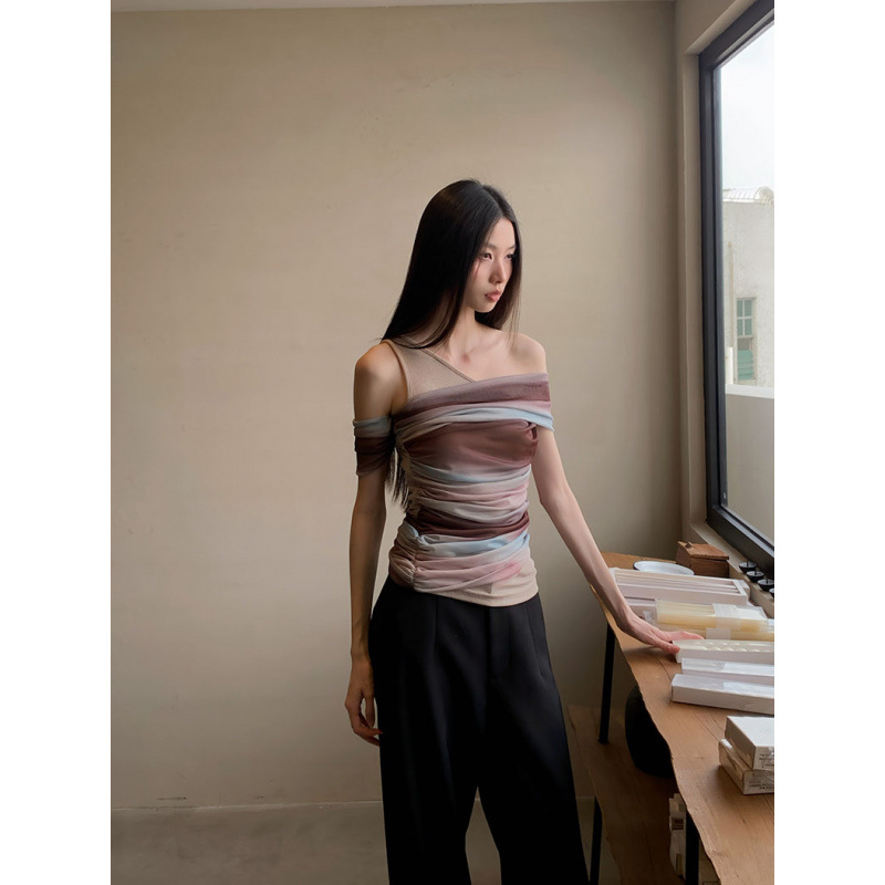 スポットメッシュTシャツレディースプリント&ダイプリント不規則ショルダートップ