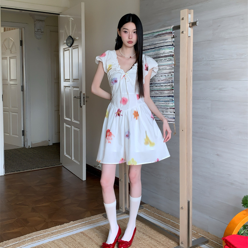 スポットレトロプリント巾着Vネックパフスリーブスカート花柄ドレス