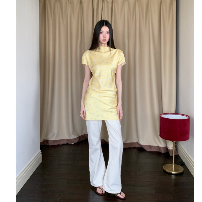 イエロープリントの新しい中国風ドレープトップ/ドレスツーウェア