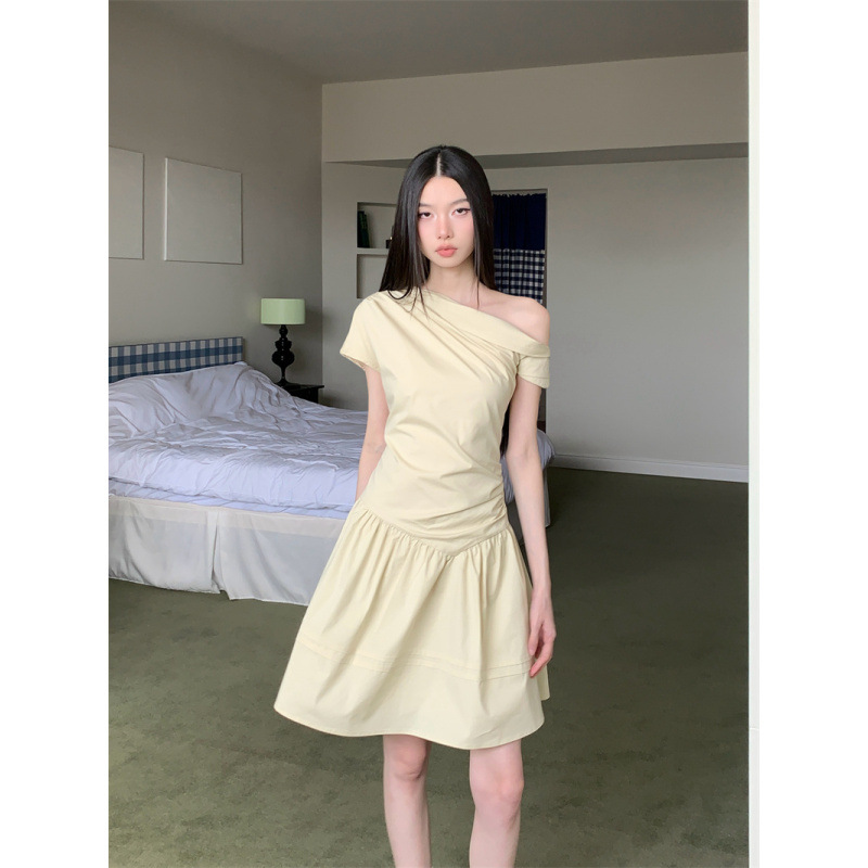 スポットデザイン気質ウエスト痩身斜め肩ベージュドレスAラインショートスカート女性用