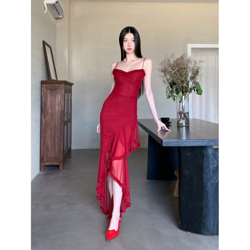 レッドフィッシュテールスカート海辺休暇サスペンダースカートメッシュドレス女性の新しいスタイル