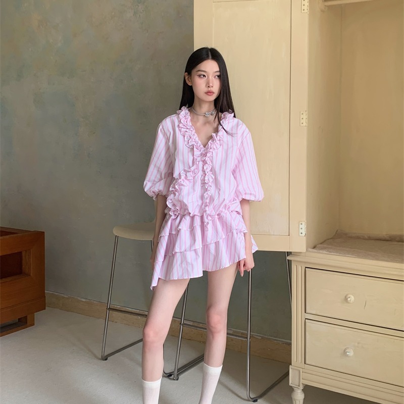 スポットピンクストライプシャツスカート立体レースレース耳ドレス