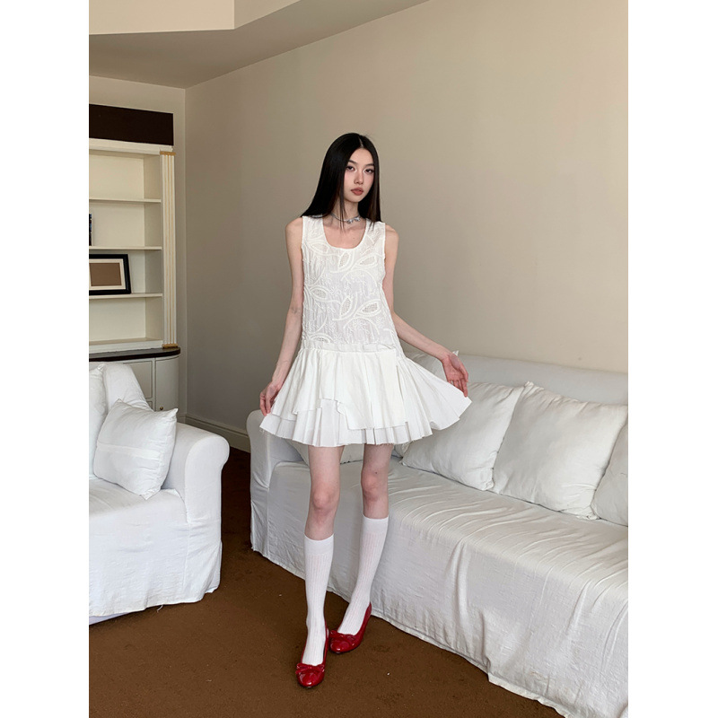 スポット中空刺繍レースショートスカート不規則な裾ローエッジベストドレス