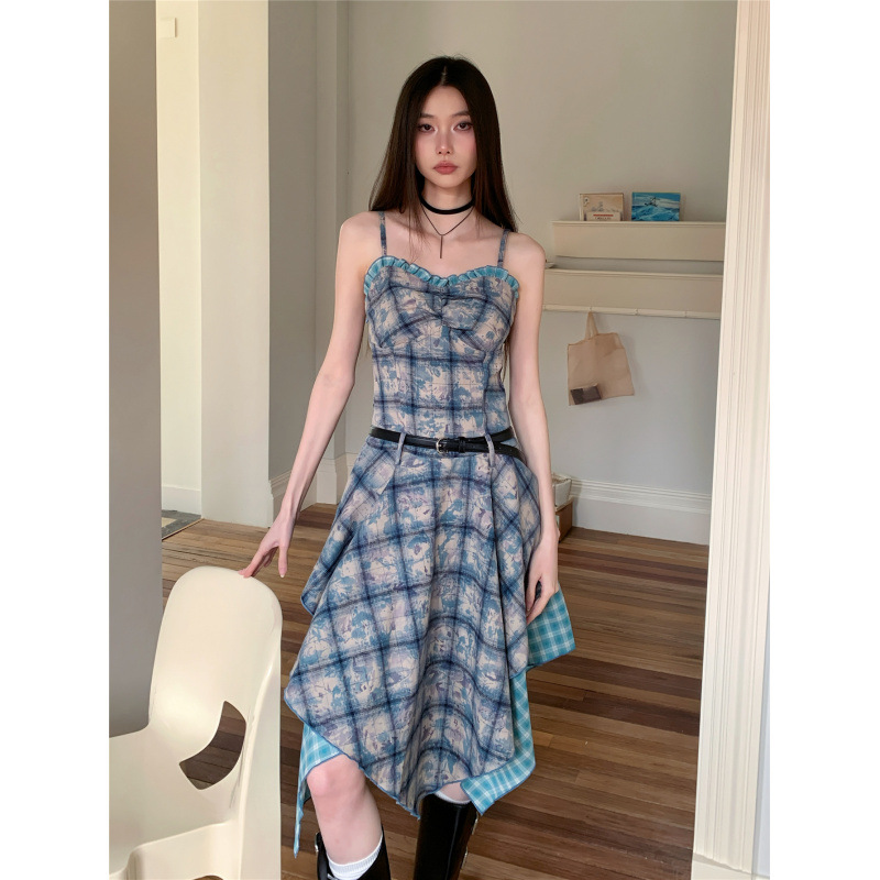 在庫ありフレンチ不規則チェック柄サスペンダードレスレディース夏新作ウエストスカート
