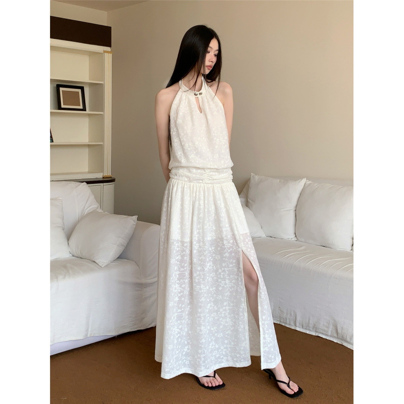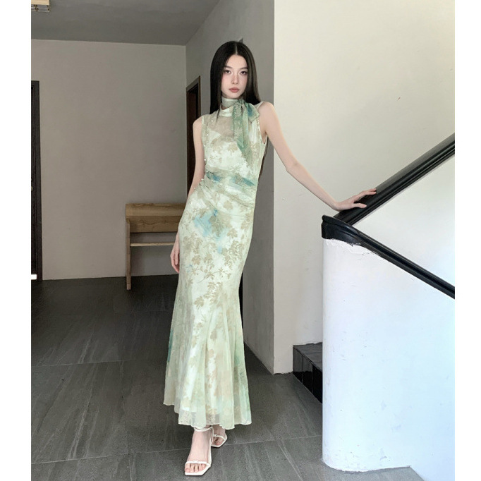 在庫ありファッショナブルな微透けレースジャカードホルターネックノースリーブウエストドレス女性用