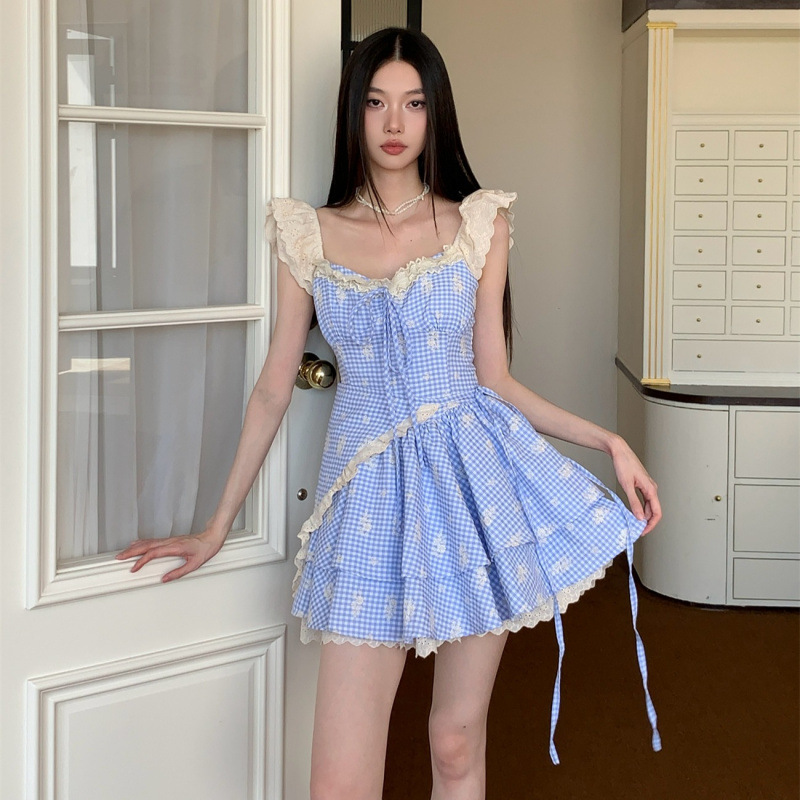 レトロなブルーのチェック柄スカート、小さなフライングスリーブドレス、ガーリーなふわふわスカート