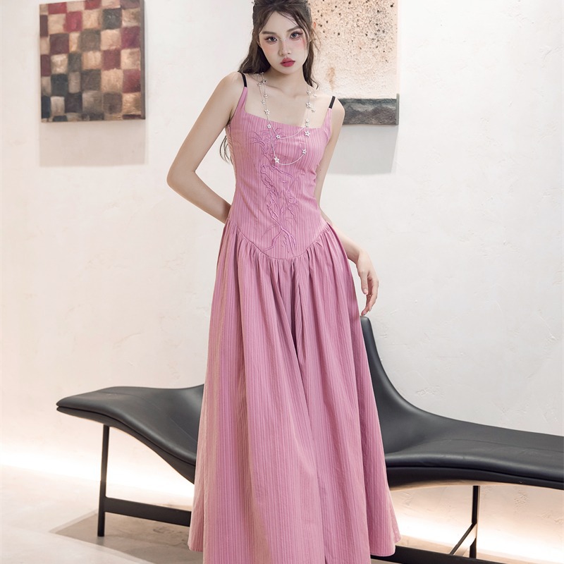 新しい中国風の綿刺繍ロングドレス背中の開いたサスペンダーホリデースカート