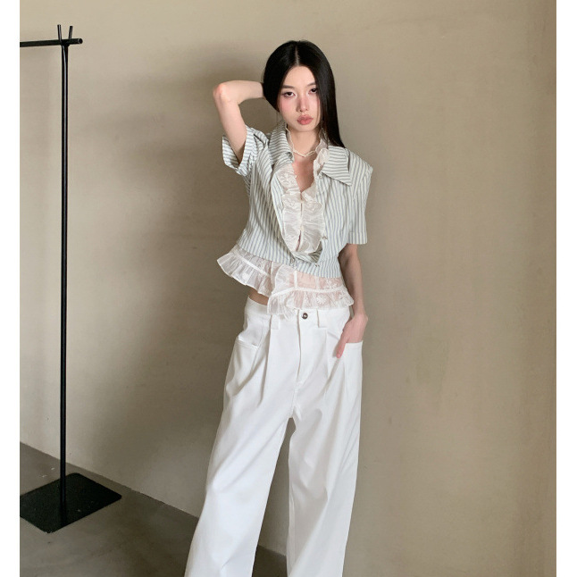フェイクツーピースストライプ半袖シャツレディースフレンチトップ