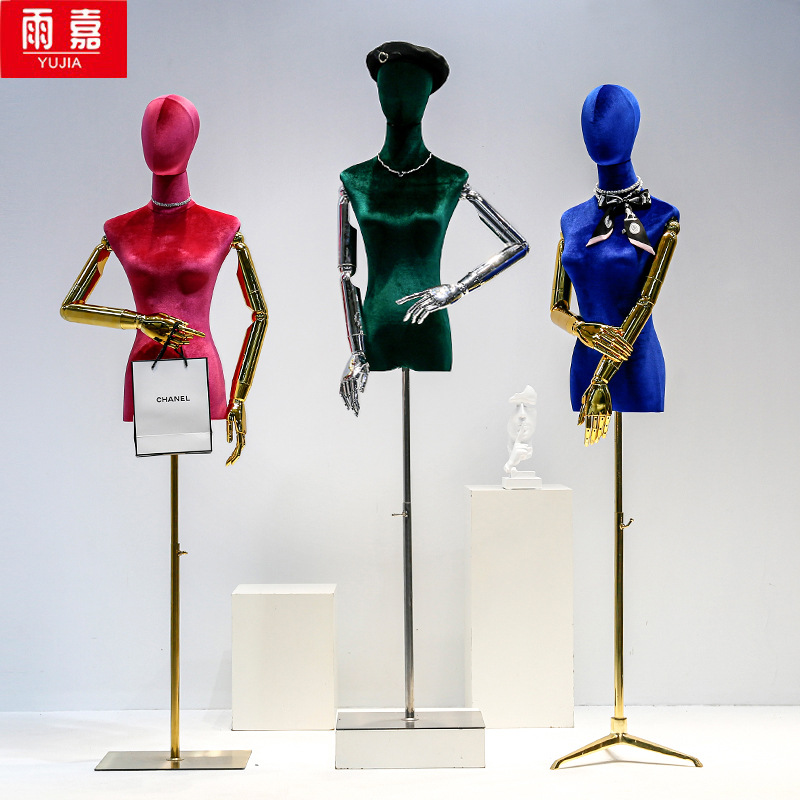 女性の半身のモデルの道具のカラーの金のベルベットの布のモデルの棚のショーウインドーの展示棚の下着のウェディングドレスの服のモデル