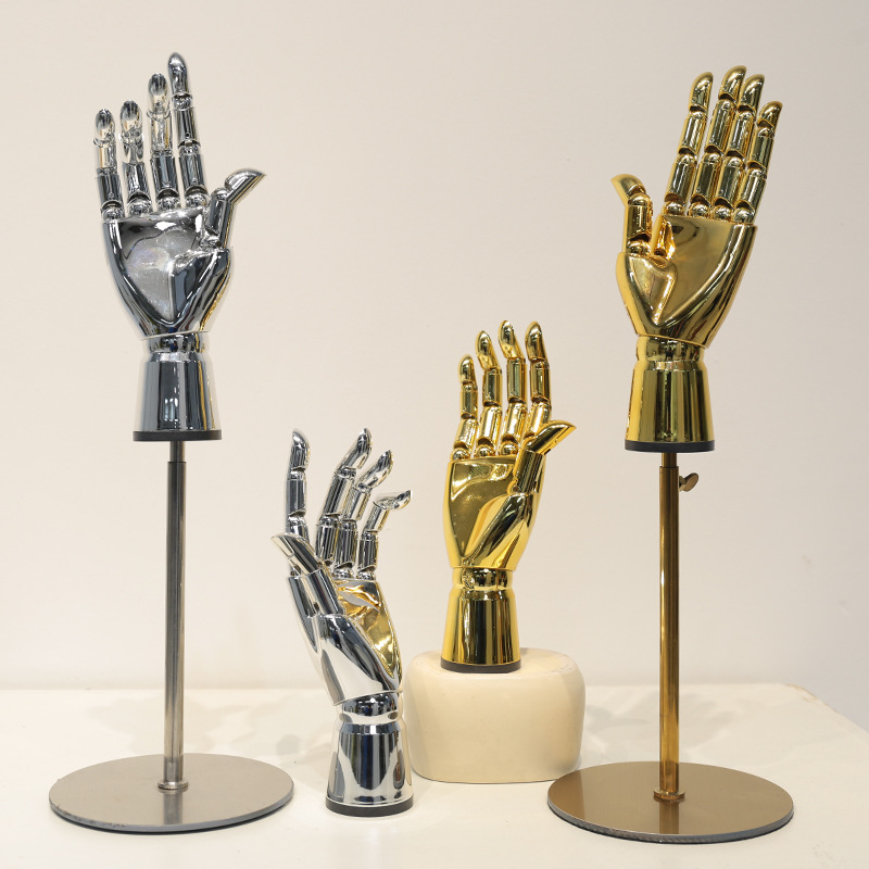 衣料品店のアトリエの装飾品のメッキの手の型の道具のショーウインドーは金銀を陳列して関節の手の模型を展示します。