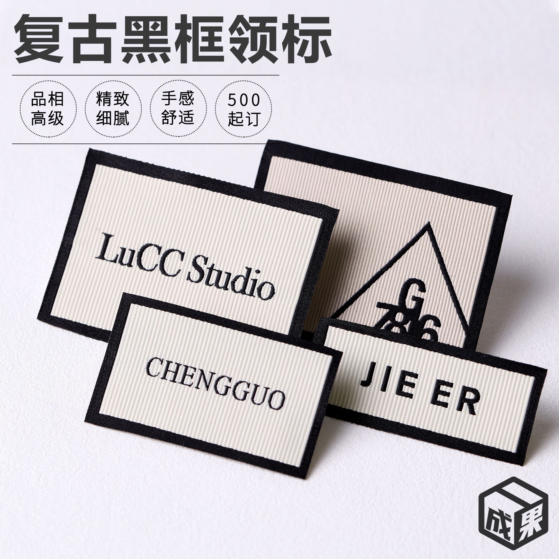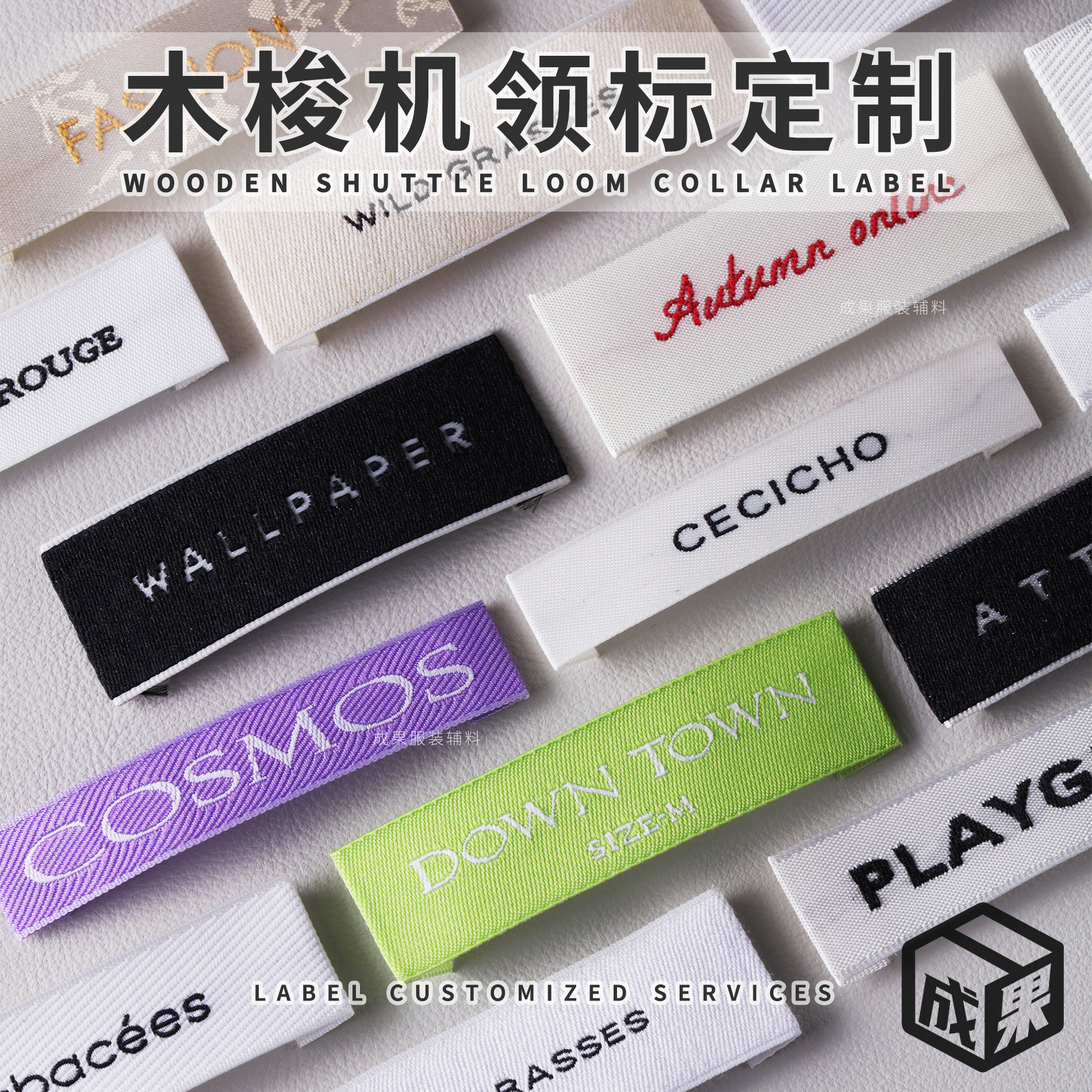 衣料品・家庭用繊維品用ネームタグ、肌に優しい綿糸織りロゴ、広州高級少量生産用商標、メインロゴ布ラベル工場