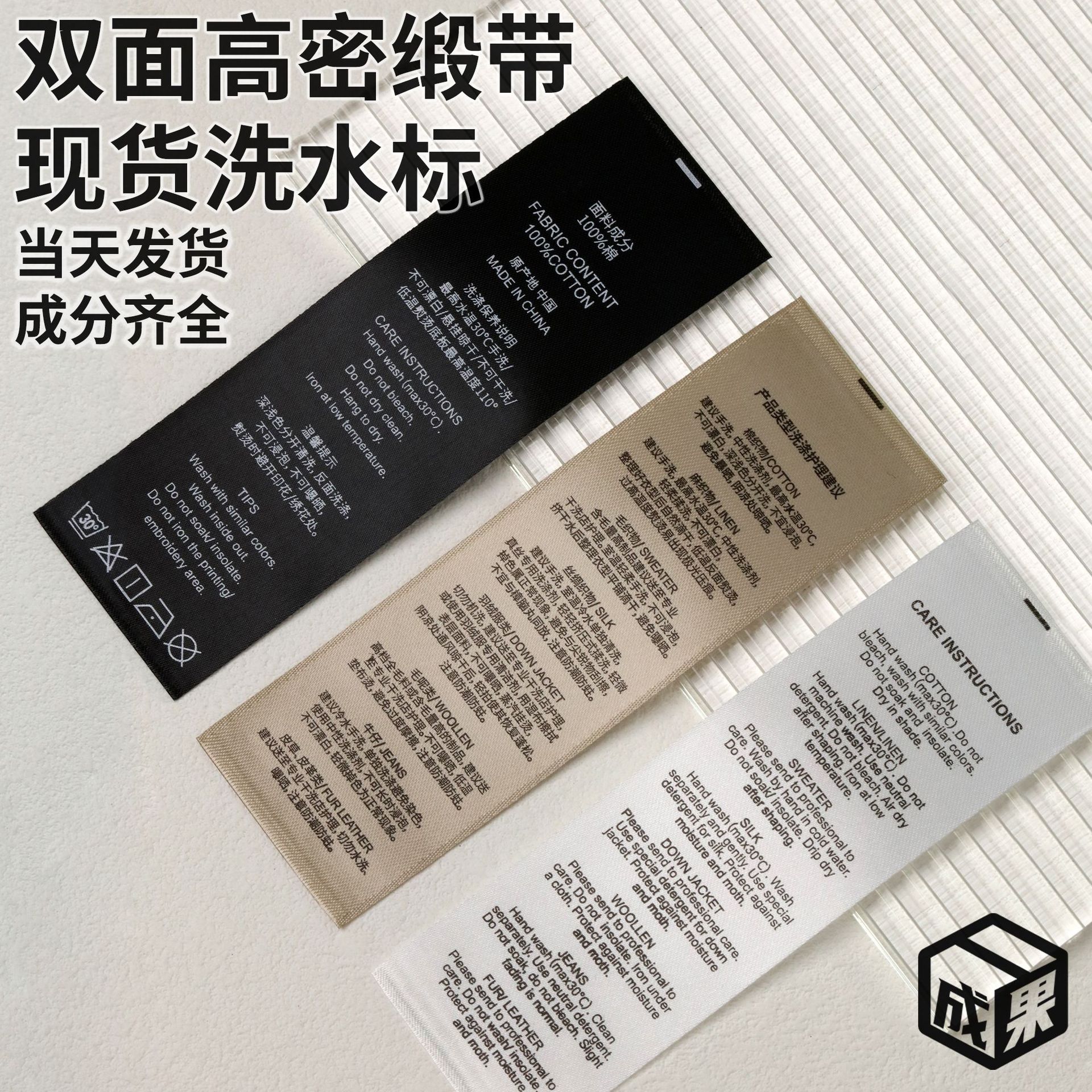 現物成分洗水標両面高密度黒白金リボン通用服装家紡中英洗水唄ラベル