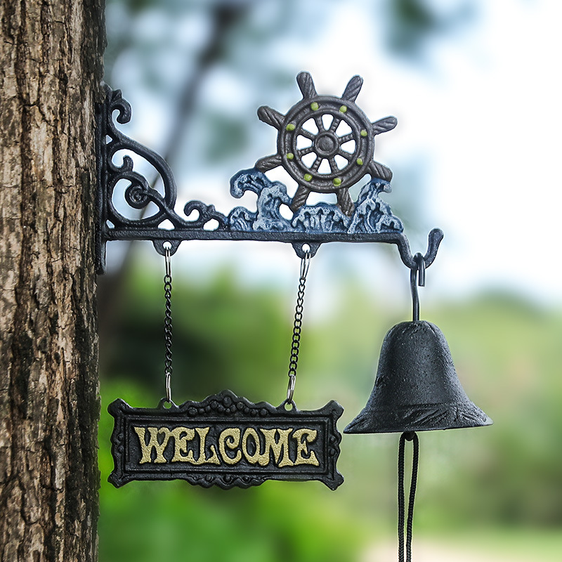 ヨーロッパのレトロな船の舵と波の花の手は揺れ動くことを歓迎します。