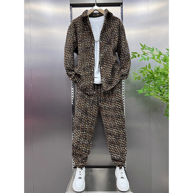 春の新型シェニール男性カジュアルスーツファッションゆるい襟シャツコート長ズボン1体2点セット