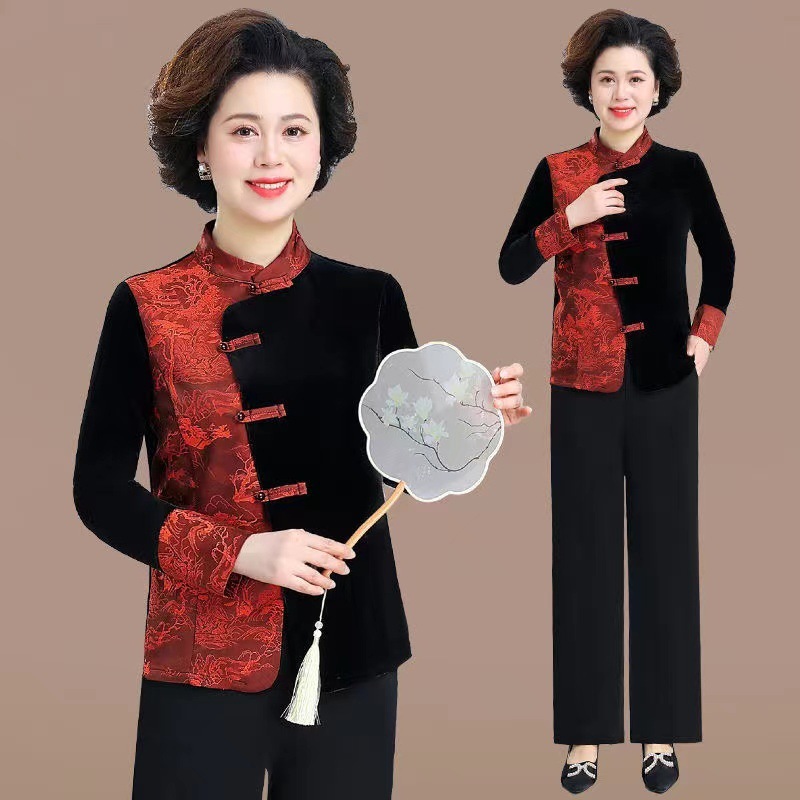 唐装のお母さんの新型の春装の国風の上着の2セットの大きいサイズの中高年の春秋の女性のコートの中年の人のスーツ
